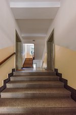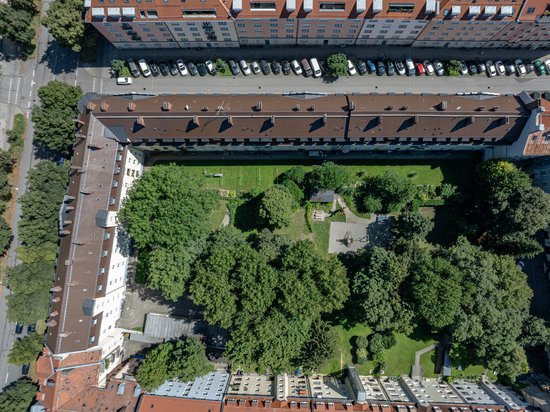 Im parkähnlichen Innenhof bekommt man vom städtischen Trubel rund um den Volksheimbau freilich nichts mit. Üppige Grünflächen und ein alter und beeindruckend hoch gewachsener Baumbestand, zahlreiche Sitzmöglichkeiten und ein Spielplatz mit Sandkasten und Spielgeräten machen den Hof zu einer Begegnungsstätte für Jung und Alt und zu einem grünen Idyll zwischen Prinzregenten- und Einsteinstraße.